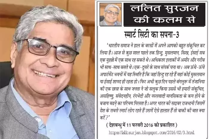 'भारतीय समाज ने हाल के बरसों में अपने आपको बहुत संकुचित कर लिया है। आज से कुछ साल पहले तक हिन्दु, मुसलमान, सिख, ईसाई सब एक मुहल्ले में एक साथ रह सकते थे। अधिकतर इलाकों में अमीर और गरीब भी साथ-साथ बसते थे। एक-दूसरे के साथ संपर्क घना था। अब ऊंचे-ऊंचे अपार्टमेंट भवनों में यह स्थिति है कि जहां हिन्दु रह रहे हैं वहां कोई मुसलमान या ईसाई शायद ही रहता हो। फिर अभी कुछ दिन पहले बंगलुरू में तंजानिया की एक छात्रा के साथ जनता ने जो सलूक किया उससे भी हमारी संकुचित, असहिष्णु, संवेदनहीन, रंगभेदी और नस्लवादी मानसिकता के कम होने के बजाय बढऩे का परिचय मिलता है। अगर भारत की साइबर राजधानी जिसमें देश के सबसे स्मार्ट लोग रहते हैं उसमें ऐसे हालात हैं तो बाकी की बात क्या करें?' (देशबन्धु में 11 फरवरी 2016 को प्रकाशित) https://lalitsurjan.blogspot.com/2016/02/3.html