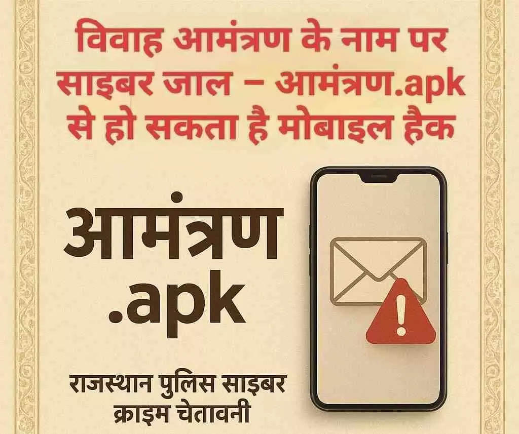 राजस्थान पुलिस ने चेतावनी जारी की है कि साइबर ठग “आमंत्रण.apk” नामक नकली ई-निमंत्रण फाइल भेजकर मोबाइल हैक कर रहे हैं। शादी सीजन में बढ़ते इन साइबर अपराधों से बचने के लिए पुलिस ने सतर्कता बरतने और केवल अधिकृत ऐप स्रोतों से ही डाउनलोड करने की सलाह दी है।