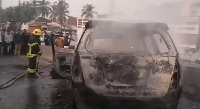 महाराष्ट्र के वसई फाटा क्षेत्र में शुक्रवार की शाम एक गंभीर सड़क हादसे के बाद उस समय अफरा-तफरी मच गई, जब इनोवा कार और बाइक की टक्कर के बाद दोनों वाहनों में अचानक भीषण आग लग गई