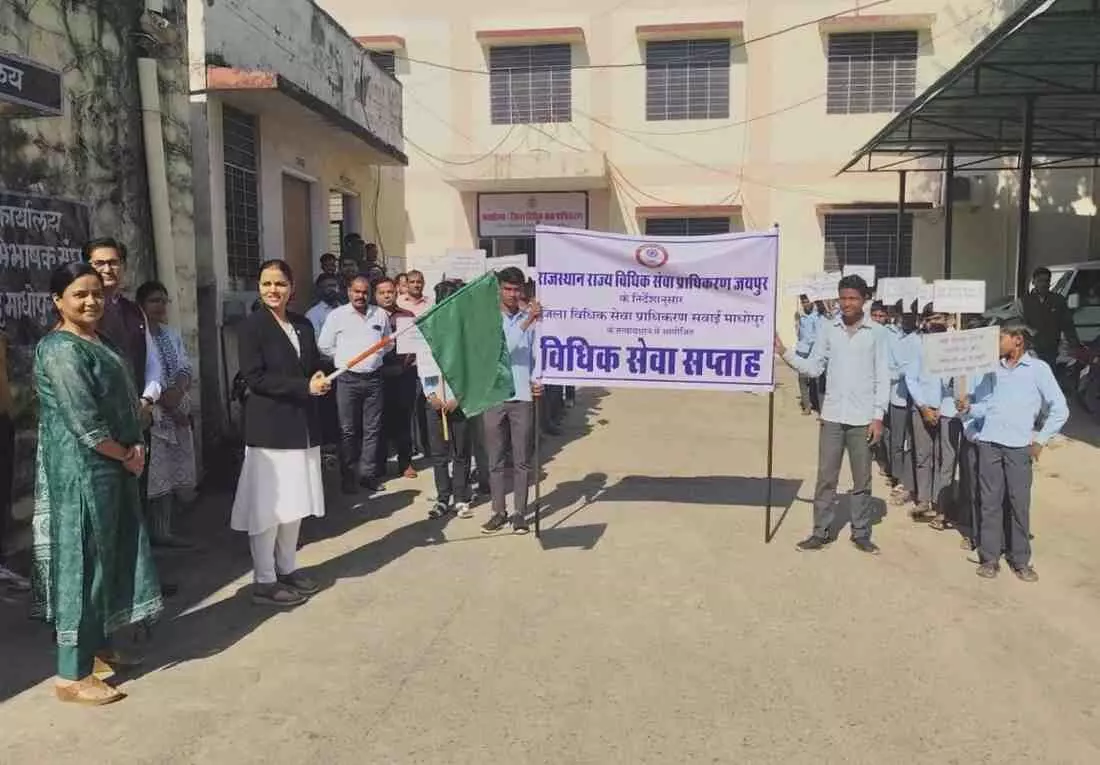 सवाई माधोपुर में विधिक सेवा सप्ताह के तहत न्यायालय परिसर से जागरूकता रैली निकाली गई। कार्यवाहक जिला न्यायाधीश भावना भार्गव व सचिव समीक्षा गौतम ने रैली को हरी झंडी दिखाकर रवाना किया। विद्यालयी छात्रों ने कानूनी जागरूकता के संदेश दिए, वहीं बालिकाओं को ‘पोश एक्ट’, पोक्सो व विधिक अधिकारों की जानकारी दी गई।