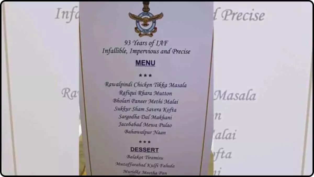 93वें वायुसेना दिवस पर भारतीय वायुसेना ने एक अनोखा डिनर मेन्यू पेश किया, जिसमें पाकिस्तानी ठिकानों के नाम पर व्यंजन शामिल थे, जैसे रावलपिंडी चिकन, बहावलपुर नान और बालाकोट तिरामिसु। यह मेन्यू भारत की सटीक सैन्य कार्यवाईयों का प्रतीक बन गया और सोशल मीडिया पर तेजी से वायरल हो गया।