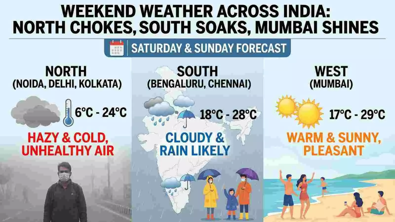 इस वीकेंड देश भर में मौसम का मिला-जुला असर देखने को मिलेगा। दिल्ली-एनसीआर और कोलकाता में जहां जहरीली हवा और कड़ाके की ठंड लोगों की मुश्किलें बढ़ाएगी, वहीं चेन्नई और बेंगलुरु में बारिश की संभावना है। मुंबई में मौसम साफ और सुहावना रहेगा। जानिए अपने शहर का सटीक वेदर रिपोर्ट और स्वास्थ्य एडवाइजरी। घर से निकलने से पहले पढ़ें यह विस्तृत मौसम पूर्वानुमान।