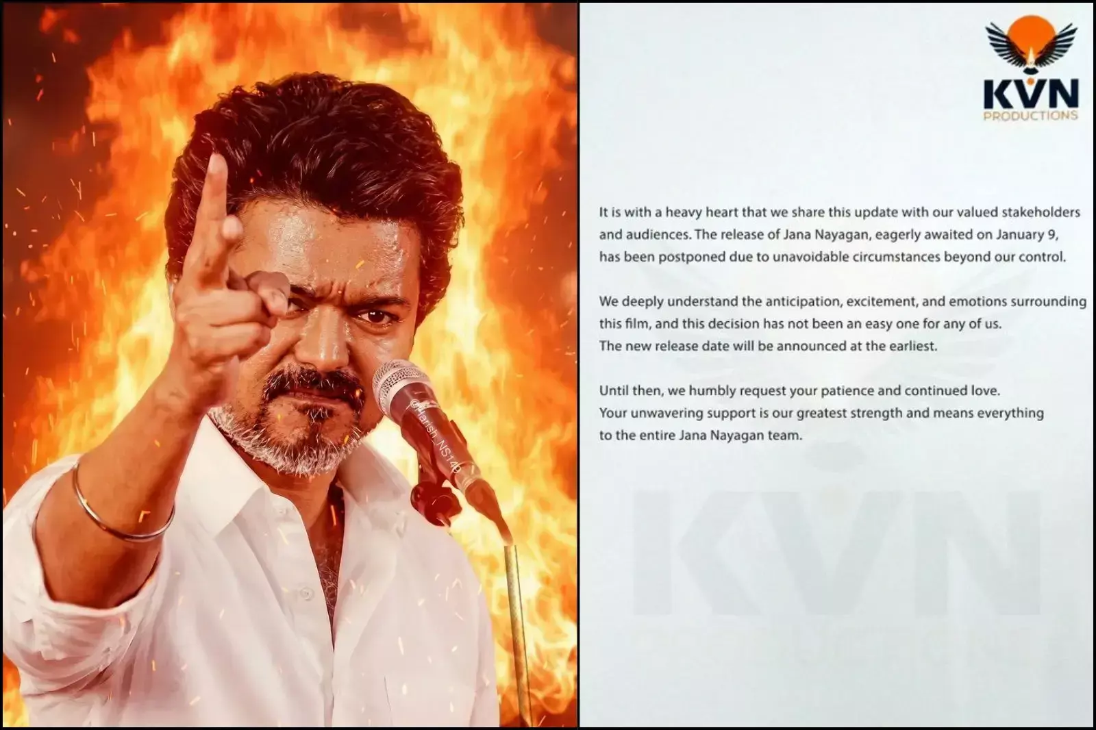TVK प्रमुख और एक्टर थलापति विजय की फिल्म जन नायकन की रिलीज फिलहाल टाल दी गई है। इस बारे में जानकारी बुधवार को फिल्म के प्रोडक्शन हाउस KVN प्रॉडक्शंस ने दी है। प्रोडक्शन हाउस ने बताया कि यह फैसला लेना आसान नहीं था। फिल्म की रिलीज डेट टलने को लेकर अपने बयान में प्रोडक्शन हाउस ने कहा, हमें यह जानकारी भारी मन से शेयर करनी पड़ रही है। 9 जनवरी को रिलीज होने वाली फिल्म जन नायकन को कुछ ऐसे कारणों की वजह से टाल दिया गया है, जो हमारे कंट्रोल में नहीं थे। KVN प्रॉडक्शंस ने यह भी कहा कि फिल्म की नई रिलीज डेट जल्द घोषित की जाएगी। साथ ही दर्शकों से धैर्य बनाए रखने और प्यार देने की अपील की गई। बयान में कहा गया कि दर्शकों का लगातार सपोर्ट ही उनकी सबसे बड़ी ताकत है और पूरी जन नायकन टीम के लिए यह बहुत मायने रखता है। फिल्म का सर्टिफिकेट जारी नहीं हुआ प्रोडक्शन हाउस के बयान में फिल्म के टलने का कारण नहीं बताया गया। हालांकि, यह फैसला ऐसे समय लिया गया, जब तय समय पर केंद्रीय फिल्म प्रमाणन बोर्ड (CBFC) की ओर से फिल्म को सर्टिफिकेट जारी नहीं किया गया। फिल्म 18 दिसंबर 2025 को सर्टिफिकेशन के लिए भेजी गई थी। शुरुआती जांच के बाद कुछ कट्स के साथ U/A सर्टिफिकेट देने की बात हुई, लेकिन फाइनल सर्टिफिकेट जारी नहीं हुआ। बाद में फिल्म को रीवाइजिंग कमेटी के पास भेज दिया गया, जिससे प्रोसेस और लंबी हो गई। CBFC ने बताया था कि फिल्म को लेकर एक शिकायत मिली थी, जिसमें धार्मिक भावनाओं और सेना के चित्रण से जुड़े मुद्दे उठाए गए थे। जिस पर फिल्म के निर्माताओं का कहना था कि यह शिकायत साफ नहीं है और इसमें किसी का नाम भी नहीं है। इसी वजह से उन्होंने इस फैसले को चुनौती दी। सर्टिफिकेट में देरी के कारण मामला मद्रास हाईकोर्ट पहुंचा। मेकर्स ने कोर्ट से तुरंत राहत की मांग की थी। हालांकि, बुधवार को कोर्ट ने इस मामले में अपना फैसला सुरक्षित रखा, जिससे फिल्म की टाइमलाइन और उलझ गई। बता दें कि यह विजय की आखिरी फिल्म मानी जा रही है। विजय तमिलगा वेट्री कजगम (TVK) पार्टी के प्रमुख हैं। उनकी पार्टी ने मार्च-अप्रैल में होने वाले तमिलनाडु विधानसभा चुनाव लड़ने का ऐलान किया है। हाल ही में विजय ने अपने एक्टिंग करियर से संन्यास लेने का ऐलान किया था। उन्होंने 33 साल के लंबे फिल्मी करियर के बाद फिल्मों को अलविदा कहने का फैसला किया। उन्होंने यह घोषणा मलेशिया में फिल्म के ऑडियो लॉन्च के दौरान की थी। विजय ने अपने करियर की शुरुआत 10 साल की उम्र में तमिल फिल्म वेट्री से बाल कलाकार के तौर पर की थी। 18 साल की उम्र में उन्होंने फिल्म नालैया थीरपू (1992) से बतौर हीरो डेब्यू किया। बता दें कि विजय की 2015 की फिल्म पुली के बाद से उनकी कोई भी फिल्म फ्लॉप नहीं हुई। बीस्ट (2022), वारिसु (2023) और द ग्रेटेस्ट ऑफ ऑल ट
