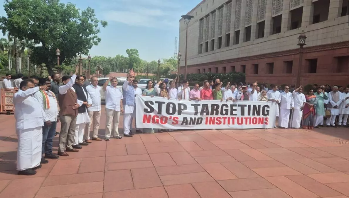 FCRA संशोधन विधेयक पर लोकसभा में जोरदार हंगामा, विपक्षी दलों ने संसद परिसर में किया प्रदर्शन