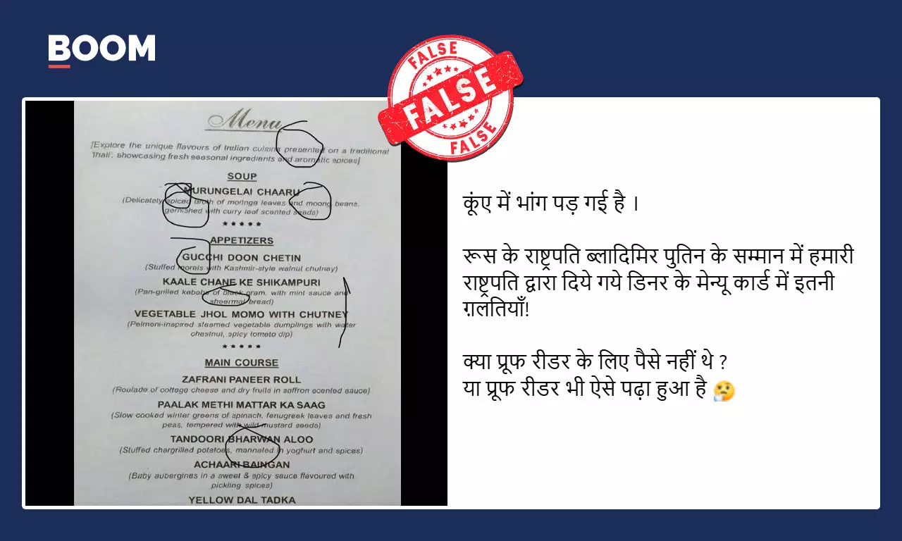 बूम ने पाया कि राष्ट्रपति भवन में रूसी राष्ट्रपति पुतिन के लिए आयोजित राजकीय भोज वाले मूल मेन्यू कार्ड में इस तरह की कोई शाब्दिक गलती नहीं थी.