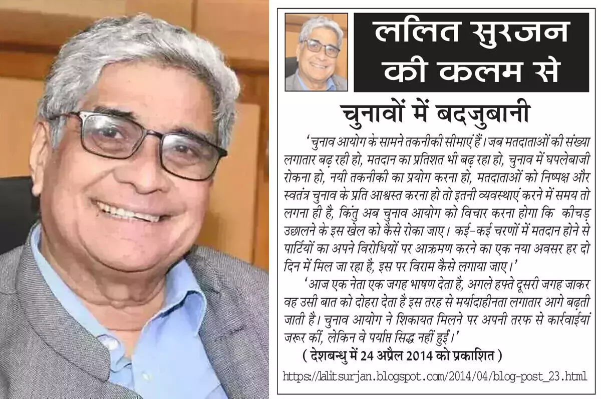 'चुनाव आयोग के सामने तकनीकी सीमाएं हैं। जब मतदाताओं की संख्या लगातार बढ़ रही हो, मतदान का प्रतिशत भी बढ़ रहा हो, चुनाव में घपलेबाजी रोकना हो, नयी तकनीकी का प्रयोग करना हो, मतदाताओं को निष्पक्ष और स्वतंत्र चुनाव के प्रति आश्वस्त करना हो तो इतनी व्यवस्थाएं करने में समय तो लगना ही है, किंतु अब चुनाव आयोग को विचार करना होगा कि कीचड़ उछालने के इस खेल को कैसे रोका जाए। कई-कई चरणों में मतदान होने से पार्टियों का अपने विरोधियों पर आक्रमण करने का एक नया अवसर हर दो दिन में मिल जा रहा है, इस पर विराम कैसे लगाया जाए।' 'आज एक नेता एक जगह भाषण देता है, अगले हफ्ते दूसरी जगह जाकर वह उसी बात को दोहरा देता है इस तरह से मर्यादाहीनता लगातार आगे बढ़ती जाती है। चुनाव आयोग ने शिकायत मिलने पर अपनी तरफ से कार्रवाईयां जरूर कीं, लेकिन वे पर्याप्त सिद्ध नहीं हुईं।' (देशबन्धु में 24 अप्रैल 2014 को प्रकाशित) https://lalitsurjan.blogspot.com/2014/04/blog-post_23.html