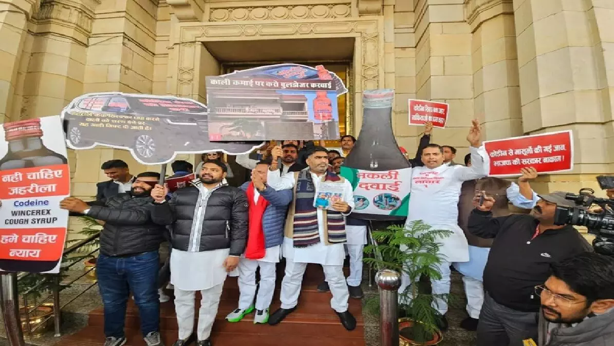 उत्तर प्रदेश विधानसभा परिसर में सपा का प्रदर्शन, कोडीन कफ सिरप मामले में सरकार पर लगाए आरोप