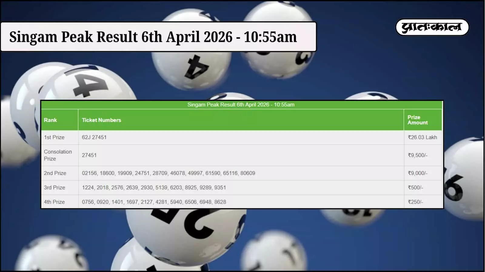 अरुणाचल प्रदेश सिंघम पीक लॉटरी के 6 अप्रैल 2026 सुबह 10:55 बजे के परिणाम घोषित। टिकट संख्या 62J 27451 ने जीता 26.03 लाख का प्रथम पुरस्कार। पूरी सूची यहाँ देखें।