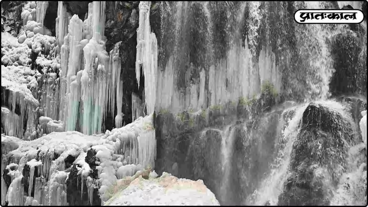 कश्मीर में कड़ाके की ठंड का असर: गुलमर्ग के पास स्थित प्रसिद्ध द्रंग झरना (Drung Waterfall) पूरी तरह जम गया है। 'फ्रोजन' झरने के मनमोहक दृश्य को देखने के लिए बारामूला में पर्यटकों की भारी भीड़ उमड़ी। जानें कैसे हाड़ कपा देने वाली सर्दी के बीच महाराष्ट्र और देश भर के सैलानी कश्मीर की वादियों में विंटर वंडरलैंड का आनंद ले रहे हैं। पूरी रिपोर्ट यहाँ पढ़ें।