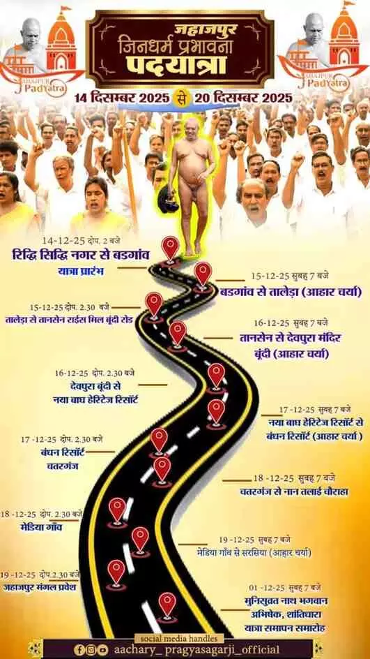 कोटा से जहाजपुर तक 14 दिसंबर से शुरू हो रही जिनधर्म प्रभावना पदयात्रा में 700 से अधिक श्रावक भाग लेंगे। आचार्य 108 श्री प्रज्ञासागर जी के सानिध्य में धर्मध्वज रथ, देव रथ और वाद्य रथों के साथ यह यात्रा धार्मिक, आध्यात्मिक और सांस्कृतिक महत्व लिए हुए है।