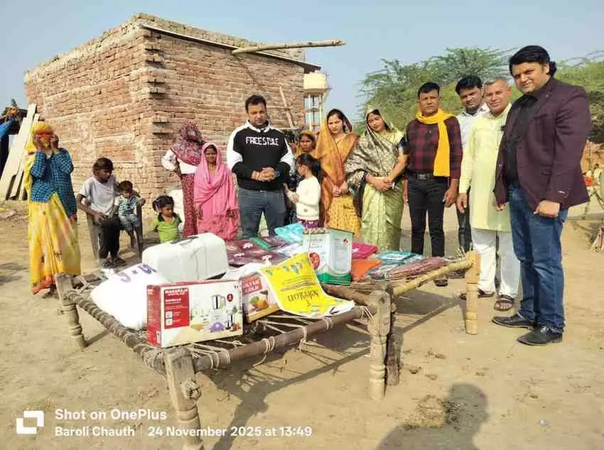डीग जिले के बरौली चौथ गांव में हरिजन बस्ती की गरीब बेटी की शादी में पूर्व पंचायत सदस्य पूनम शर्मा और भामाशाहों ने गृहस्ती का भव्य सामान भेंट किया। ग्यारह साड़ियों, सिलाई मशीन, रसोई उपकरण और नगद राशि के माध्यम से परिवार को खुशी और गरिमा का अनुभव कराया गया।