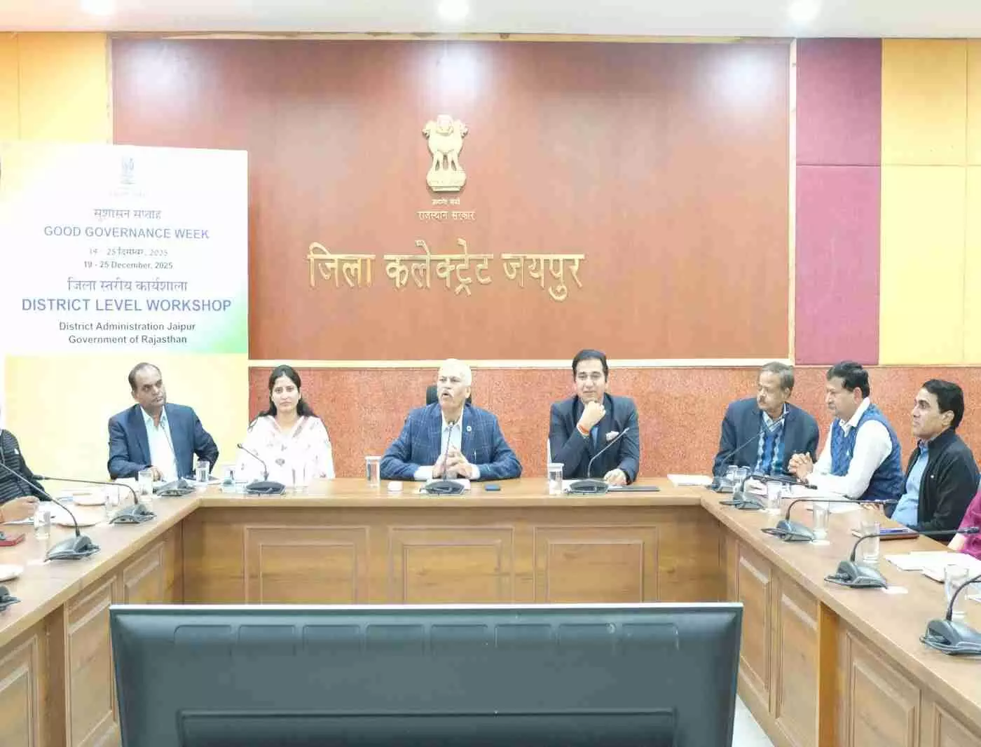 जयपुर में सुशासन सप्ताह के तहत जिला स्तरीय कार्यशाला आयोजित, पूर्व पुलिस आयुक्त डॉ. बी.एल. सोनी ने सुशासन, पारदर्शिता और समयबद्ध जनसेवा पर दिया प्रेरक संदेश। जिला प्रशासन के नवाचारों और जनहितकारी अभियानों की प्रस्तुति ने कार्यशाला को बनाया प्रभावशाली।