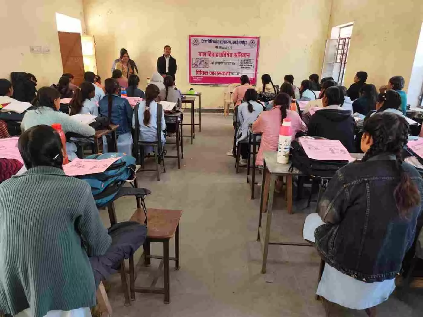 सवाई माधोपुर के मानटाउन स्कूल में 'बाल विवाह मुक्त भारत' अभियान के तहत भव्य जागरूकता शिविर संपन्न हुआ। असिस्टेंट एलएडीसी अक्षय सिंह राजावत और दीपक नामा ने छात्राओं को कानूनी अधिकारों व हेल्पलाइन 1098 की जानकारी दी। बेटियों ने बाल विवाह के खिलाफ डटकर खड़े होने और सूचना देने की शपथ ली। जानिए कैसे राजस्थान विधिक सेवा प्राधिकरण इस कुप्रथा को जड़ से खत्म करने के लिए 100 दिवसीय मिशन चला रहा है।