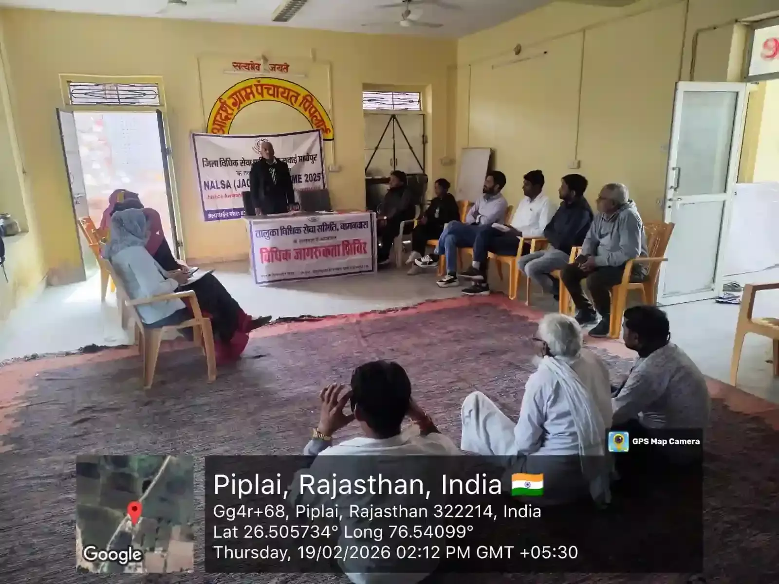 ग्राम पंचायत पिपलाई में विधिक सेवा समिति द्वारा सर्वोच्च न्यायालय के दिशा-निर्देशों, 4P फ्रेमवर्क और जनकल्याणकारी योजनाओं की विस्तृत जानकारी दी गई।
