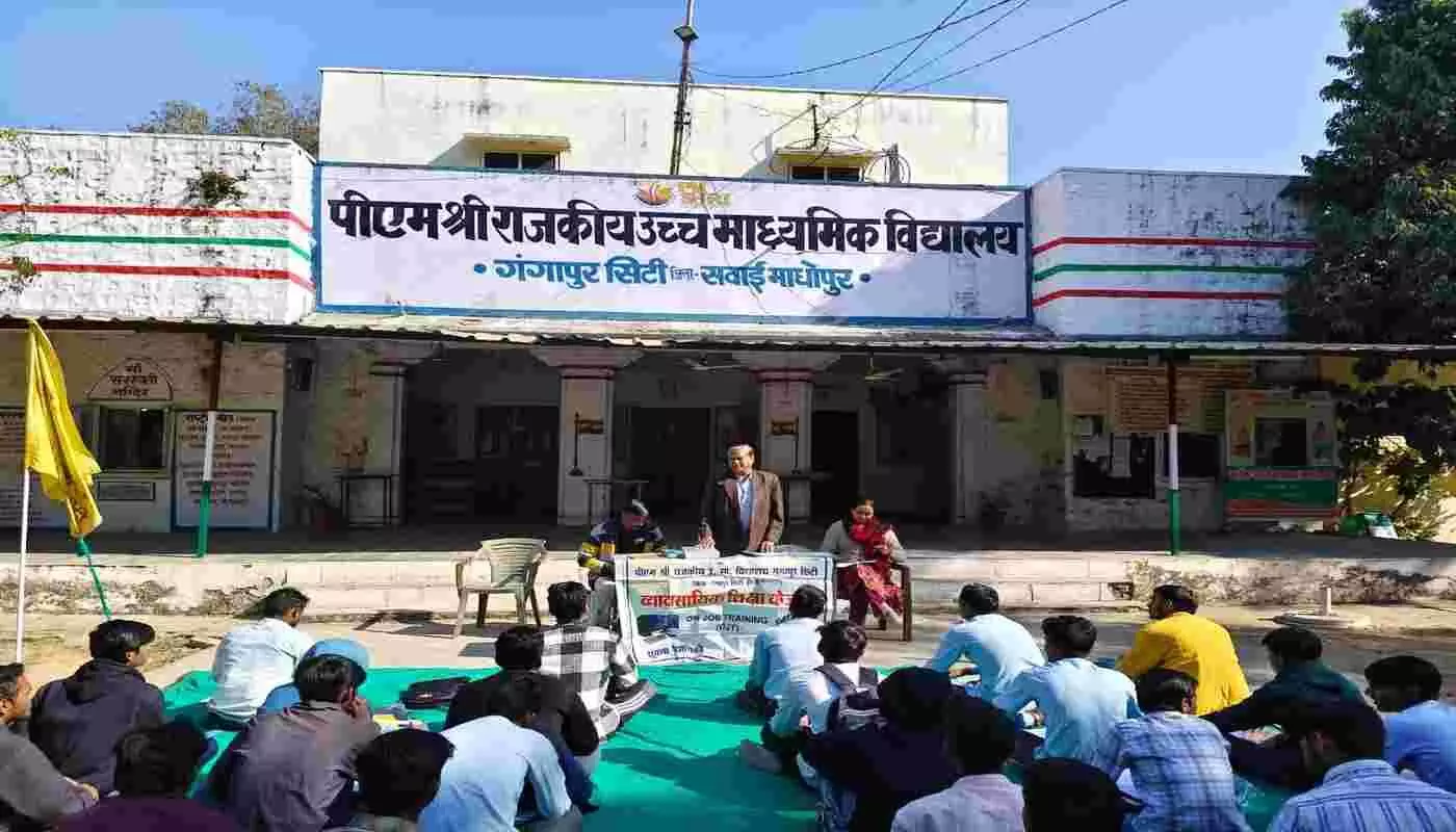 गंगापुर सिटी के पीएम श्री राजकीय उच्च माध्यमिक विद्यालय में कक्षा 11वीं और 12वीं के विद्यार्थियों के लिए ऑन जॉब ट्रेनिंग (OJT) और इंटर्नशिप कार्यक्रम का शुभारंभ। प्रधानाचार्य राजकुमार उपाध्याय ने विद्यार्थियों को प्रोत्साहित किया, और यूनिक कंप्यूटर सेंटर पर प्रशिक्षण से उन्हें व्यावहारिक अनुभव और भविष्य के रोजगार में मदद मिलेगी।