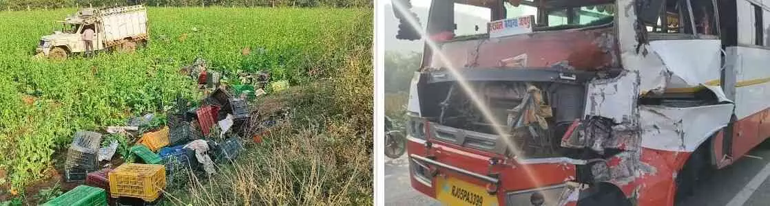बयाना–वैर मार्ग पर तेज रफ्तार लोक परिवहन बस ने सड़क किनारे खड़ी पिकअप को टक्कर मार दी। पिकअप चालक गंभीर रूप से घायल, अमरुद खेतों में बिखरे। पुलिस जांच में जुटी, ग्रामीणों ने मार्ग पर गति-नियंत्रण की मांग की। हादसे ने तेज रफ्तार और सड़क सुरक्षा की चेतावनी दी।