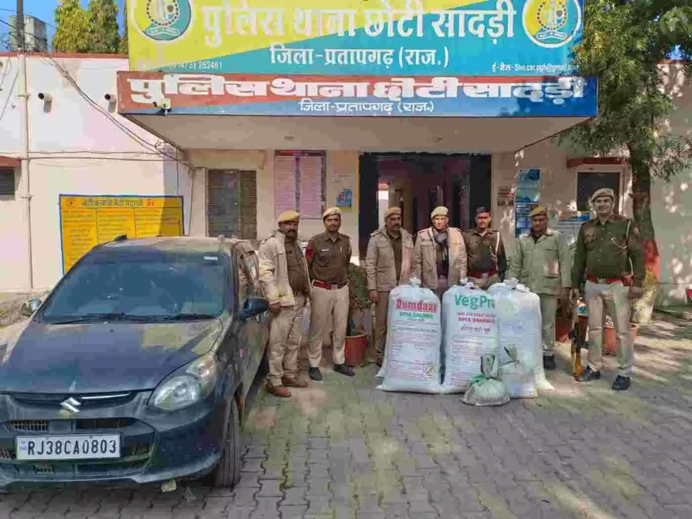 प्रतापगढ़ के छोटीसादड़ी में पुलिस और DST टीम ने ऑपरेशन चक्रव्यूह में बड़ी सफलता पाते हुए 1 क्विंटल 33 किलोग्राम अवैध अफीम डोडाचूरा और अल्टो कार जब्त की। पुलिस अधीक्षक बी. आदित्य, एएसपी गजेन्द्रसिंह जोधा, पुलिस उप अधीक्षक रामेश्वरलाल और थाना प्रभारी नारायणलाल की अगुवाई में यह कार्रवाई हुई।