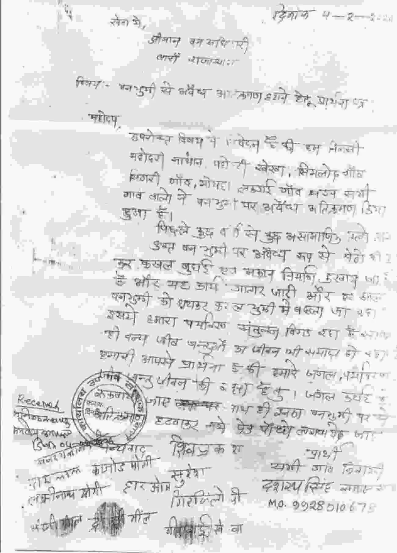 बारां जिले के नाहरगढ़ रेंज में वन भूमि पर अवैध कब्जे और पेड़ों की कटाई के विरोध में ग्रामीणों ने उपवन संरक्षक को ज्ञापन देकर कार्रवाई की मांग की।
