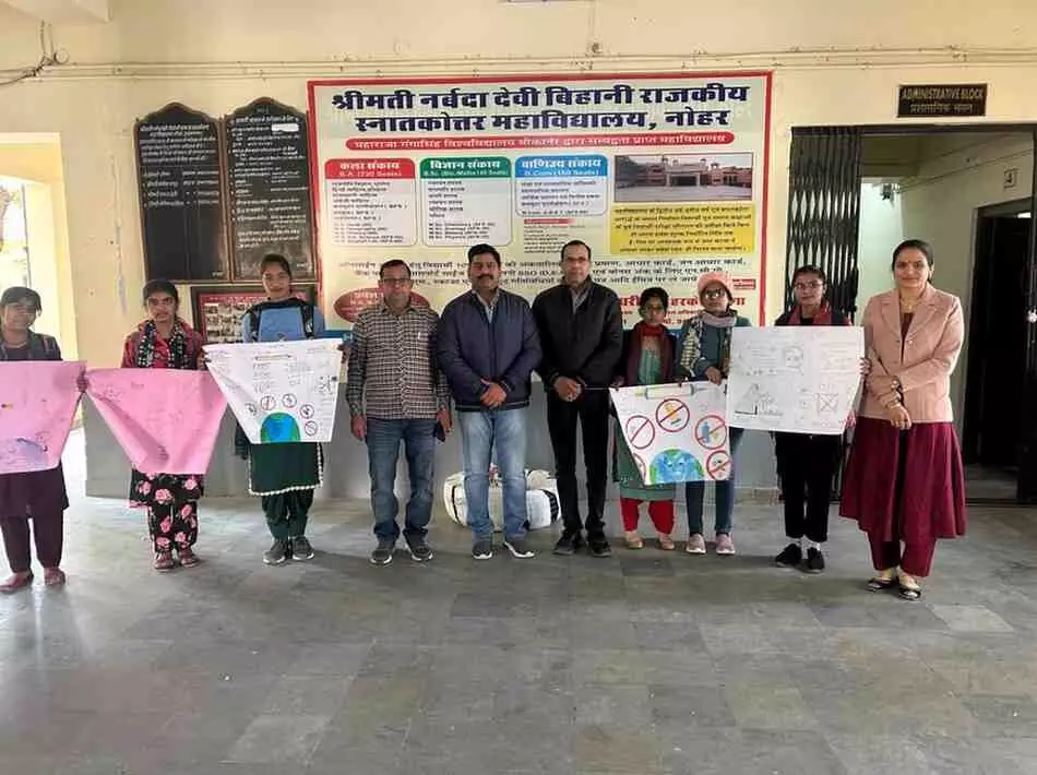 नोहर के श्रीमती नर्बदा देवी बिहानी राजकीय स्नातकोत्तर महाविद्यालय में युवा क्लब, कला क्लब एवं मानस अभियान के संयुक्त तत्वावधान में नशा मुक्ति अभियान पर पोस्टर प्रतियोगिता आयोजित हुई। कार्यक्रम में प्राचार्य सहित विशेषज्ञों ने नशे के दुष्प्रभावों पर प्रकाश डालते हुए विद्यार्थियों को नशा मुक्ति की शपथ दिलाई।