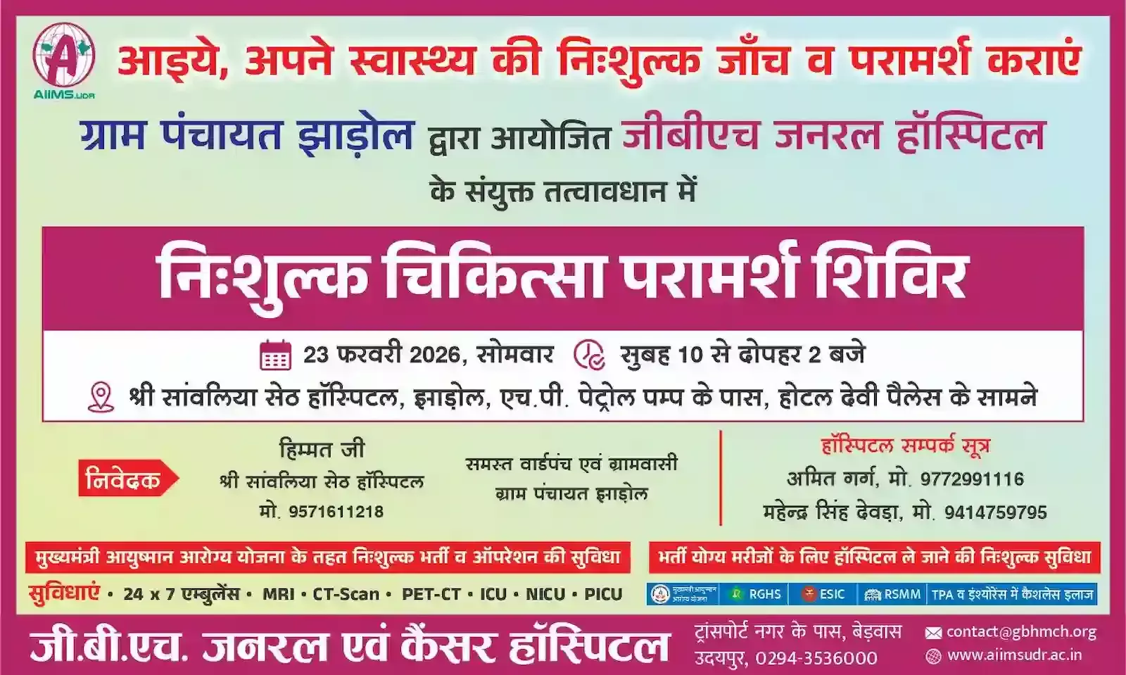 झाड़ोल में निःशुल्क चिकित्सा परामर्श शिविर, विशेषज्ञ डॉक्टर देंगे सेवाएं
