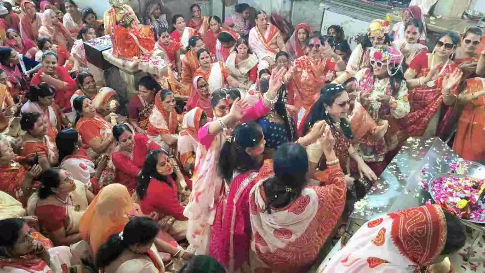 भीलवाड़ा के पुराने शहर स्थित मंदिर में महिलाओं ने ठाकुरजी के साथ फूलों की होली खेली और भजनों पर नृत्य कर फाल्गुन उत्सव का आनंद लिया।