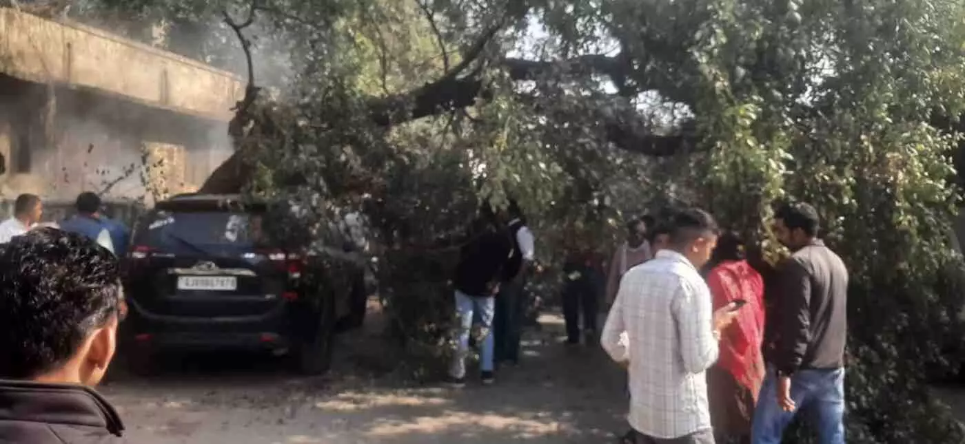 डूंगरपुर: आदर्श नगर लिंक रोड पर विशालकाय पेड़ गिरने से मची अफरा-तफरी, चपेट में आए दो वाहन