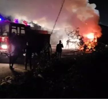 भरतपुर में बाणगंगा नदी के एक किलोमीटर चारागाह में आग लगी