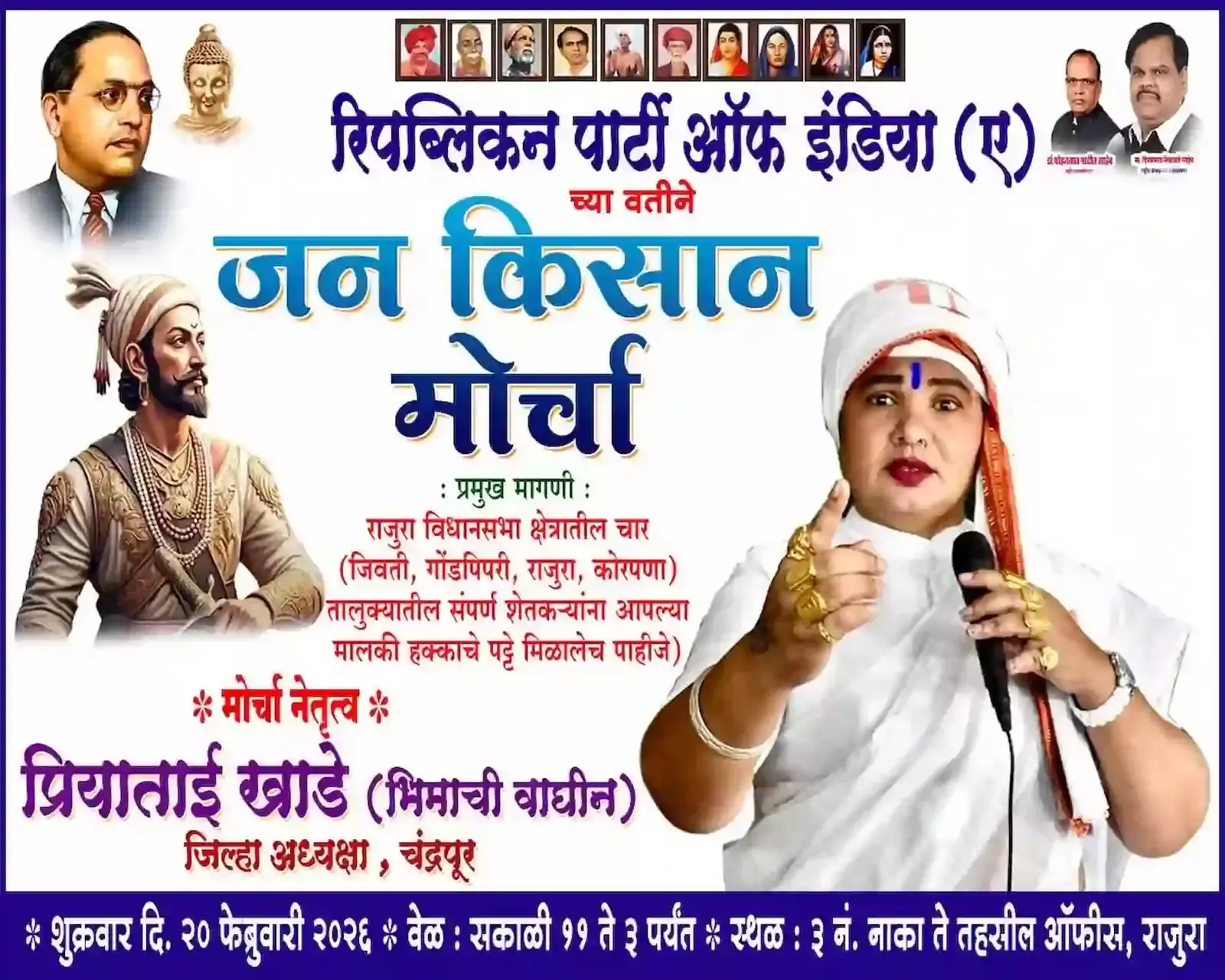 गोंडपिपरी, कोरपना, राजुरा और जिवती के किसान 20 फरवरी को अपनी जमीनों के कानूनी पट्टे प्राप्त करने हेतु नाका नंबर 3 से तहसील कार्यालय तक मार्च करेंगे।