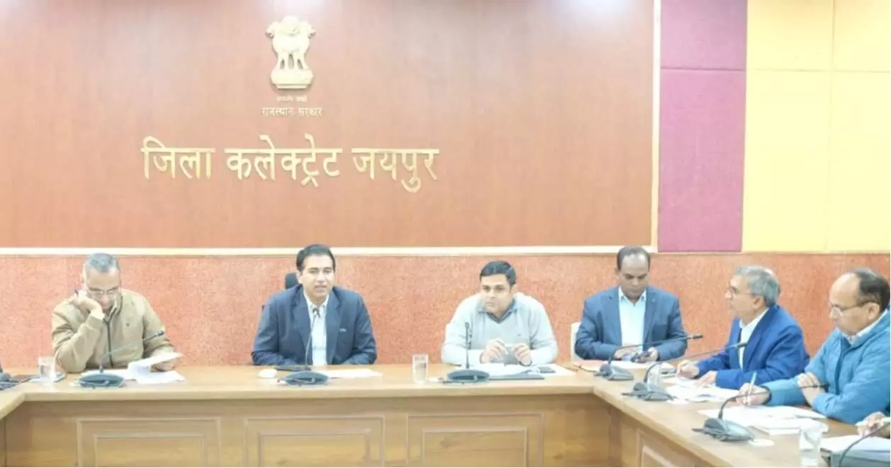 जयपुर जिला कलेक्ट्रेट सभागार में आयोजित समीक्षा बैठक के दौरान जिला कलक्टर डॉ. जितेन्द्र कुमार सोनी (बाएं से दूसरे) अधिकारियों को ग्राम उत्थान शिविरों के प्रभावी क्रियान्वयन हेतु निर्देश देते हुए।
