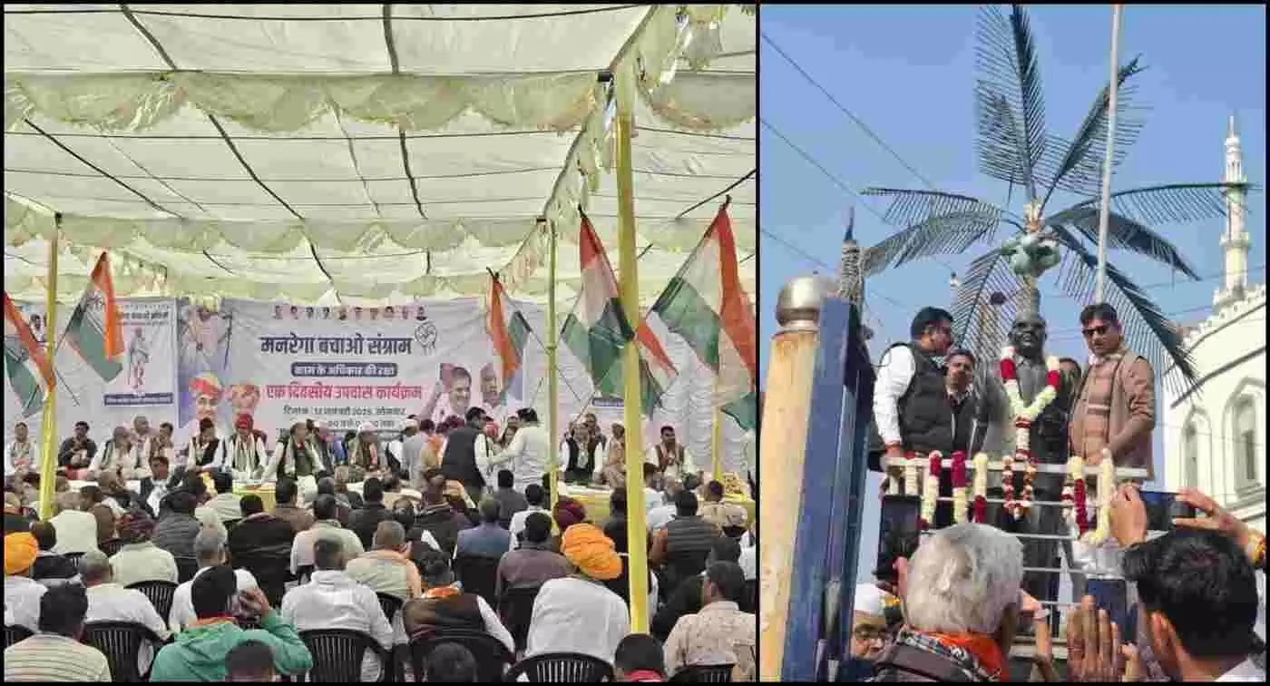 भीलवाड़ा में मनरेगा बचाओ संग्राम जनआंदोलन के तहत जिलाध्यक्ष रामलाल जाट के नेतृत्व में कांग्रेस ने एक दिवसीय उपवास कर केंद्र सरकार के खिलाफ मोर्चा खोला। मनरेगा एक्ट में बदलाव को किसान-मजदूर विरोधी बताते हुए कांग्रेस ने 6 फरवरी तक चलने वाले चरणबद्ध आंदोलन का ऐलान किया है। जानिए भीलवाड़ा रेल्वे स्टेशन पर हुए इस विरोध प्रदर्शन और एक्ट में हुए बड़े बदलावों के बारे में पूरी जानकारी।