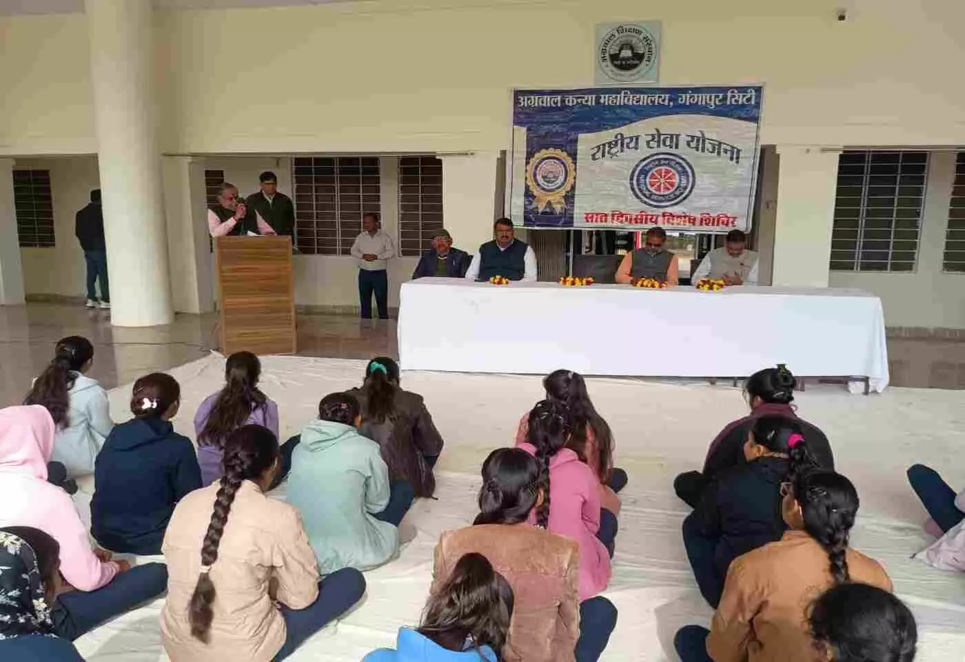 गंगापुर सिटी के अग्रवाल कन्या महाविद्यालय में राष्ट्रीय सेवा योजना का सात दिवसीय विशेष शिविर ध्वजारोहण और लक्ष्य गीत के साथ प्रारंभ हुआ। शिविर का उद्घाटन शिक्षण संस्थान पदाधिकारियों की उपस्थिति में हुआ, जिसमें समाजसेवा, नेतृत्व विकास, स्वावलंबन और पर्यावरण संरक्षण पर जोर दिया गया।