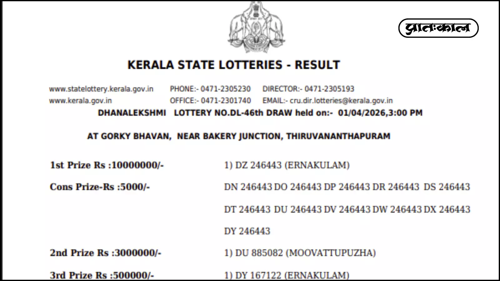 केरल धनलक्ष्मी लॉटरी DL-46 के परिणाम घोषित। एर्नाकुलम के टिकट DZ 246443 ने जीता ₹1 करोड़ का बंपर इनाम। यहाँ देखें सभी विजेताओं की पूरी सूची।