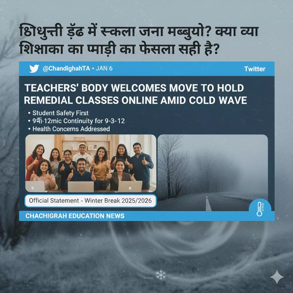 चंडीगढ़ शिक्षा विभाग ने ठंड और शीतलहर के बीच सुधारात्मक कक्षाओं को ऑनलाइन मोड में संचालित करने का निर्णय लिया। चंडीगढ़ टीचर्स एसोसिएशन और अध्यक्ष रमेश चंद्र शर्मा ने इसे समयोचित और छात्रों की सुरक्षा के लिए उचित कदम बताया। यह ऑनलाइन शिक्षा का सुरक्षित और व्यावहारिक विकल्प है।