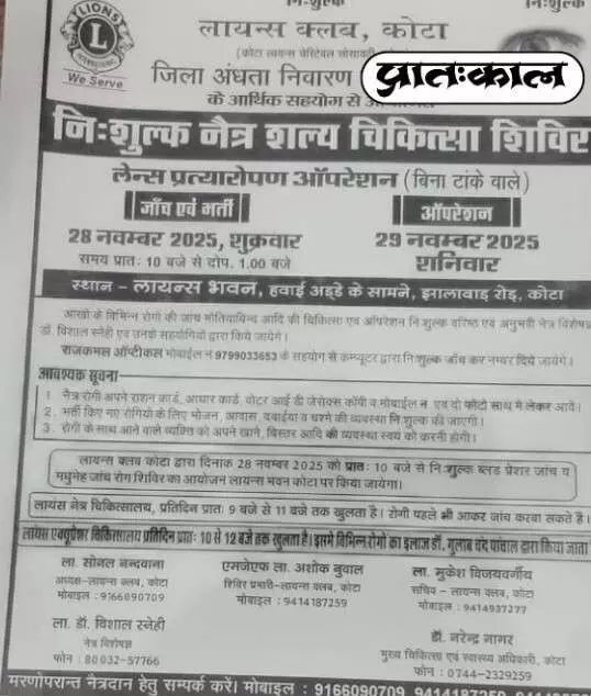 लायंस क्लब कोटा आयोजित कर रहा निःशुल्क नेत्र शल्य चिकित्सा शिविर, 28-29 नवम्बर को