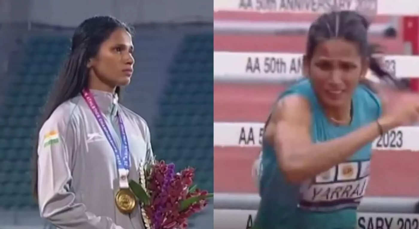दक्षिण कोरिया के गुमी में एशियाई एथलेटिक्स चैम्पियनशिप 2025 में 100 मीटर हर्डल्स में स्वर्ण जीतने वाली ज्योथी याराजी का सुनसान स्टेडियम में तिरंगा फहराते हुए भावनात्मक पल सोशल मीडिया पर वायरल, महिलाओं की संघर्ष और दृढ़ता का प्रतीक बना।