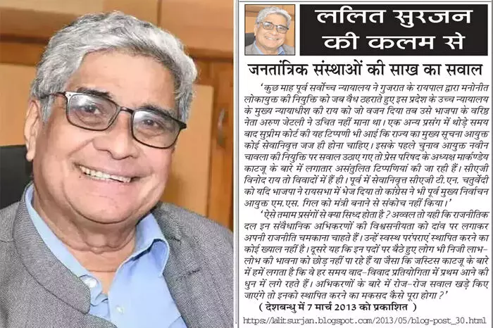 'कुछ माह पूर्व सर्वोच्च न्यायालय ने गुजरात के रायपाल द्वारा मनोनीत लोकायुक्त की नियुक्ति को जब वैध ठहराते हुए इस प्रदेश के उच्च न्यायालय के मुख्य न्यायाधीश की राय को जो वजन दिया तब उसे भाजपा के वरिष्ठ नेता अरुण जेटली ने उचित नहीं माना था