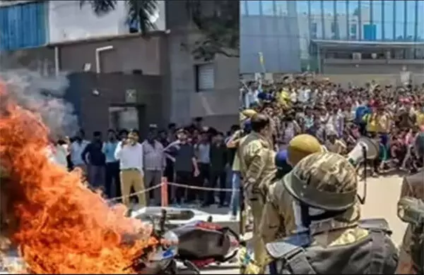 नोएडा के फेज़-2 में प्रदर्शन हिंसक हो गया, और एक पुलिस वैन और दूसरी गाड़ियों में तोड़फोड़ की गई,