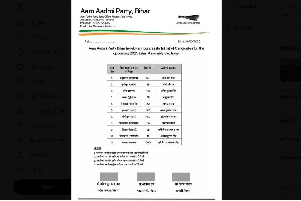 बिहार : आम आदमी पार्टी ने 11 उम्मीदवारों की पहली सूची जारी की