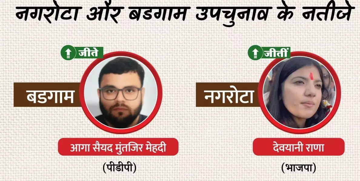 जम्मू कश्मीर विधानसभा उपचुनाव के नतीजे शुक्रवार को घोषित किए गए, जिसमें पीपुल्स डेमोक्रेटिक पार्टी (पीडीपी) ने बडगाम सीट और भारतीय जनता पार्टी (भाजपा) ने नगरोटा सीट पर जीत हासिल की