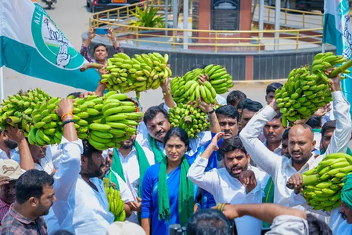 केला उत्पादन करने वाले किसानों की दुर्दशा के खिलाफ आंध्र प्रदेश कांग्रेस अध्यक्ष वाईएस शर्मिला रेड्डी बुधवार को एक अनोखा विरोध प्रदर्शन किया। वह केले से भरा एक ट्रक लेकर कडप्पा जिले के कलेक्टर कार्यालय पहुंचीं