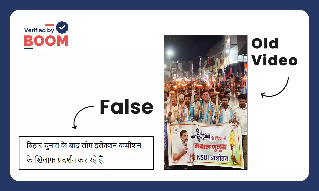 बूम ने पाया कि वायरल वीडियो अगस्त 2025 में राजस्थान के बालोतरा में एनएसयूआई द्वारा वोट चोरी के मुद्दे पर बीजेपी और चुनाव आयोग के खिलाफ निकाले गए मशाल जुलूस का है.
