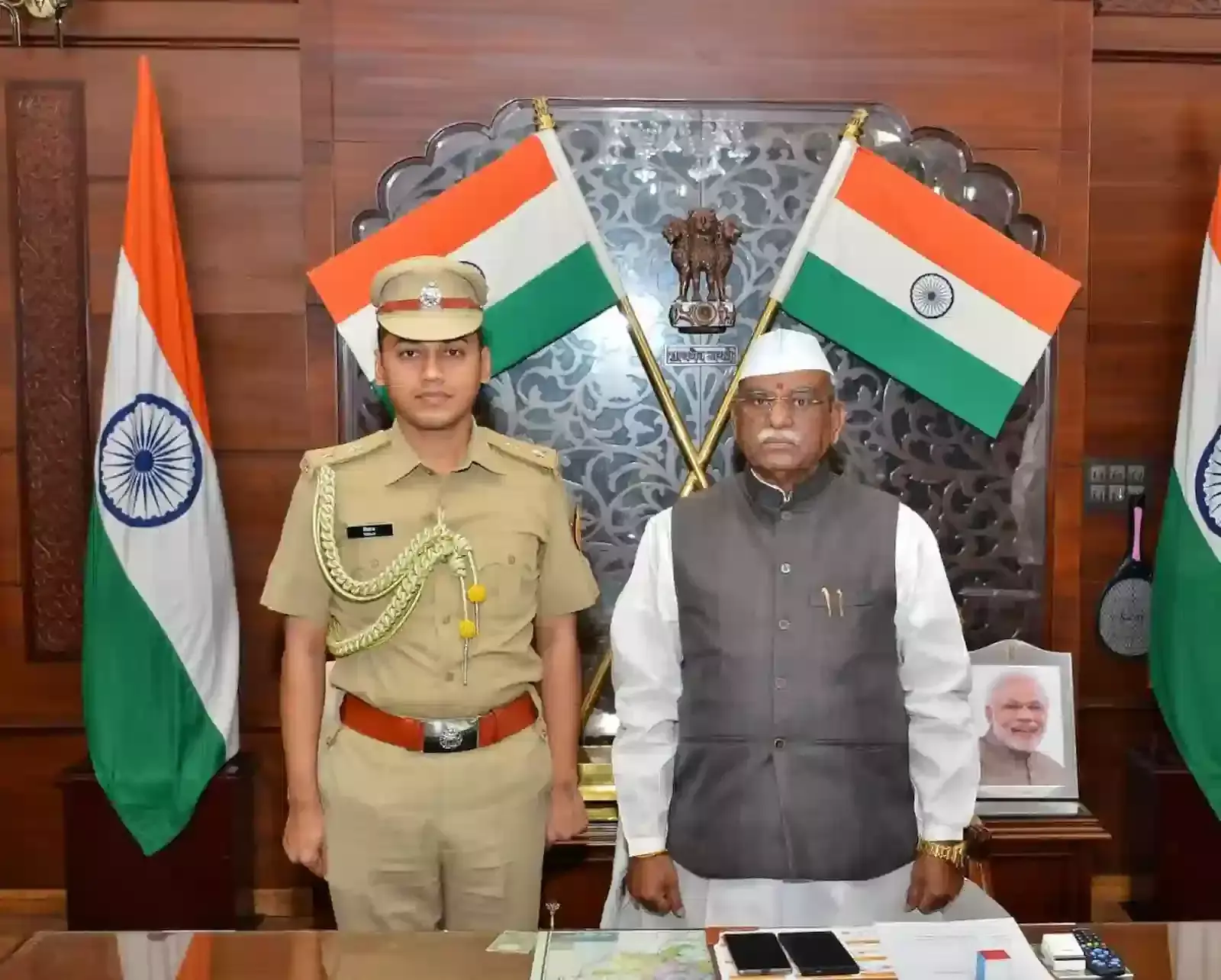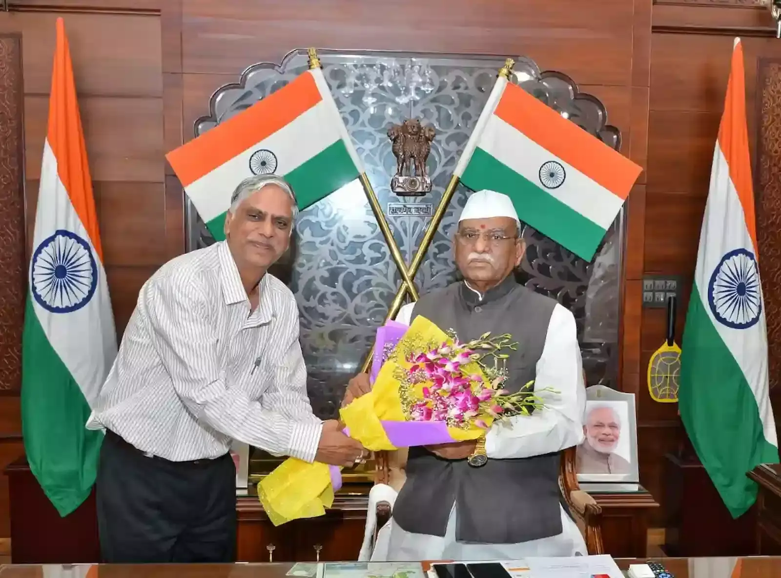 पूर्व मुख्यमंत्री ने पत्रकार दीनदयाल उपाध्याय पुस्तक स्वीकार की और भाजपा नेता धर्मनारायण जोशी की कुशलता पूछी।