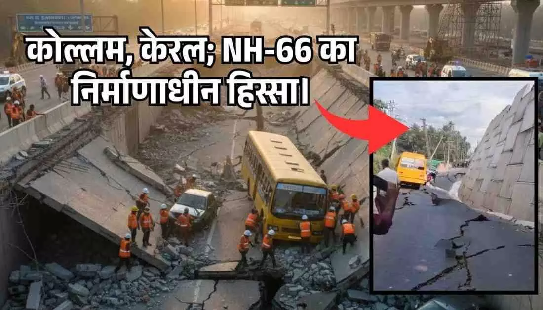 केरल के कोल्लम में धँसा NH-66 का अप्रोच रोड, स्कूल बस समेत फँसी कई गाड़ियाँ...