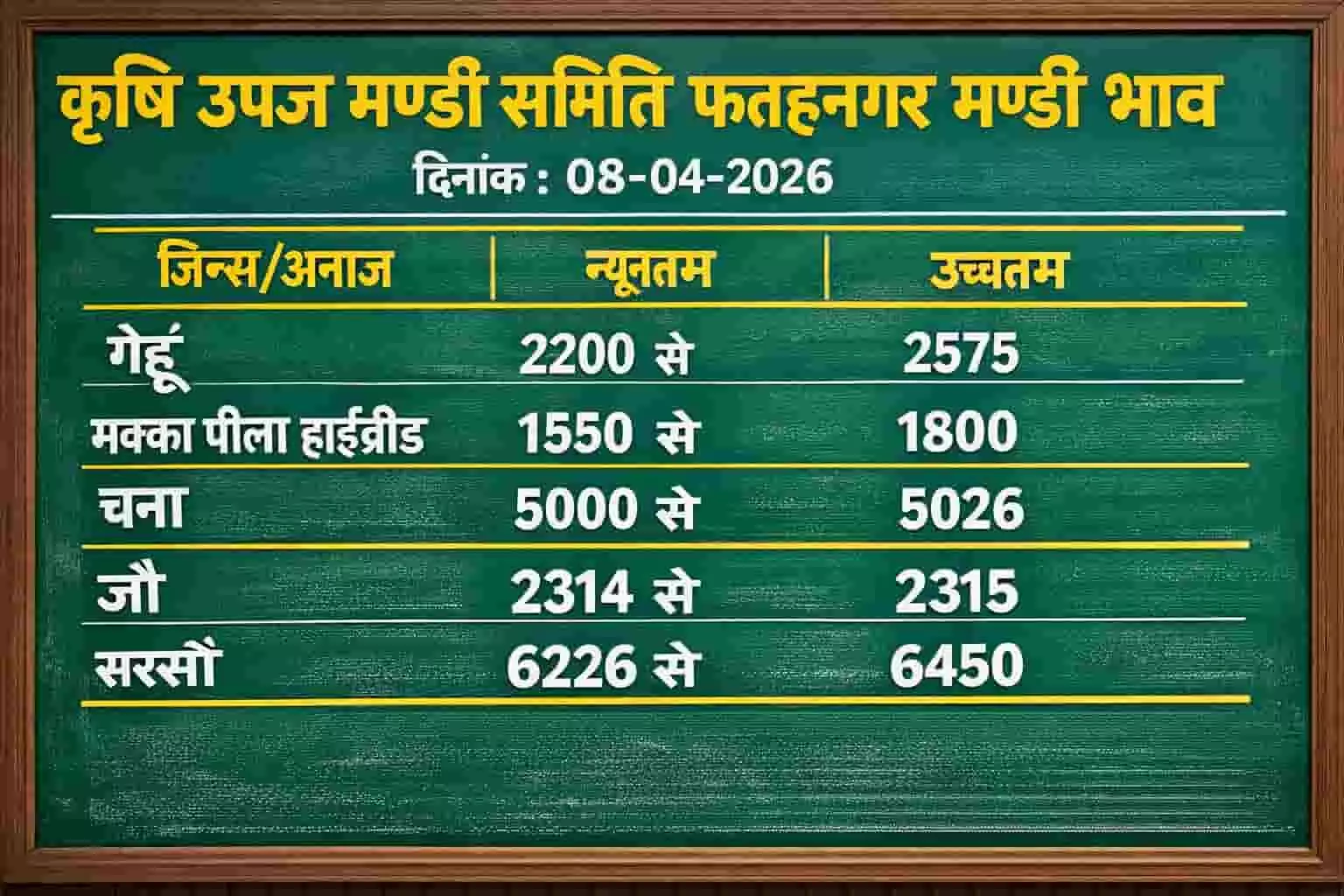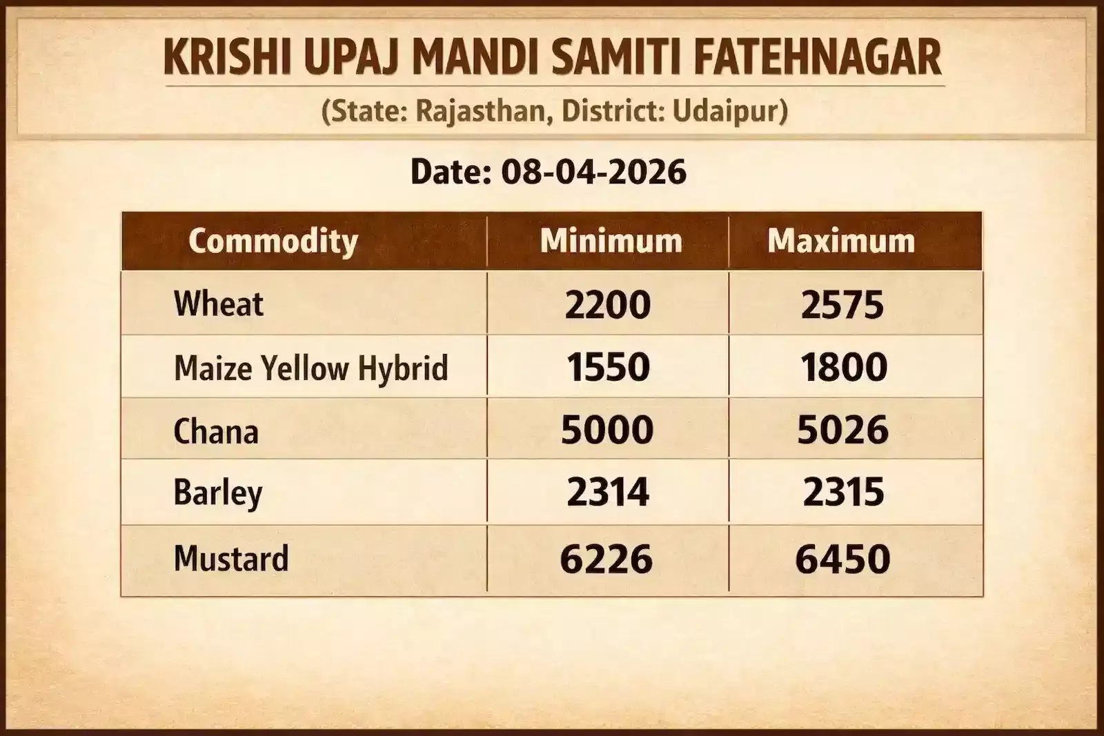 उदयपुर की फतहनगर मण्डी में गेहूं 2575 और सरसों 6450 रुपये प्रति क्विंटल तक पहुंची, मण्डी प्रशासन ने जारी किए विभिन्न कृषि जिन्सों के आधिकारिक व्यापारिक आंकड़े।