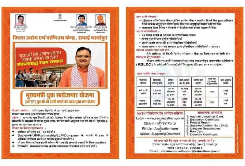 डीग के शिक्षित युवाओं के लिए मुख्यमंत्री युवा स्वरोजगार योजना (MYSY) के तहत आवेदन शुरू हो गए हैं। आठवीं पास से लेकर स्नातक युवाओं को विनिर्माण और सेवा क्षेत्र में उद्यम स्थापित करने के लिए 10 लाख रुपये तक के ऋण पर 100% ब्याज अनुदान और भारी सब्सिडी दी जा रही है। जानिए कैसे करें ऑनलाइन आवेदन और क्या हैं पात्रता की शर्तें।