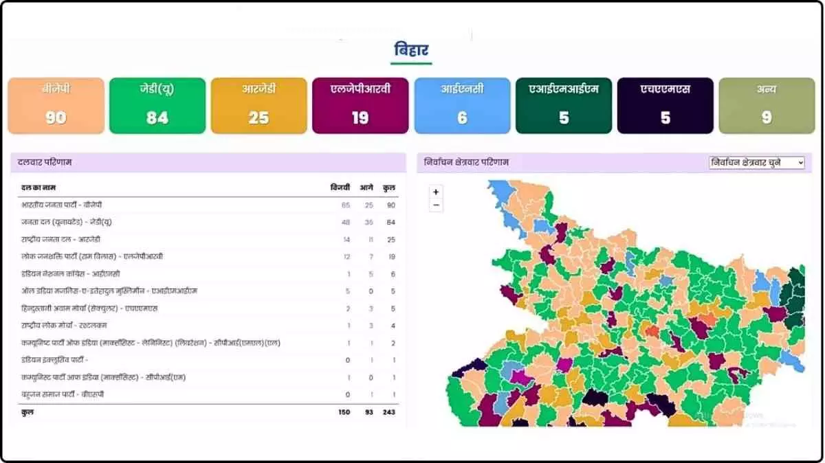 Bihar Election Final Result 2025 : बिहार विधानसभा चुनाव 2025 में बीजेपी 90 सीटों के साथ सबसे बड़ी पार्टी के रूप में उभरी, जबकि जेडी(यू) ने 84 सीटों पर मजबूत प्रदर्शन किया। आरजेडी, एलजेपीआरवी और अन्य दलों ने भी महत्वपूर्ण उपस्थिति दर्ज की। 243 में से 147 सीटों के नतीजे घोषित हो चुके हैं, और राज्य में सरकार गठन को लेकर सियासी हलचल तेज हो गई है।