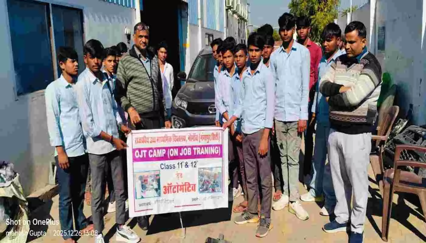 गंगापुर सिटी के पीएम श्री राजकीय उच्च माध्यमिक विद्यालय में कक्षा 11वीं और 12वीं के विद्यार्थियों के लिए ऑन जॉब ट्रेनिंग (OJT) और इंटर्नशिप कार्यक्रम का शुभारंभ। प्रधानाचार्य राजकुमार उपाध्याय ने विद्यार्थियों को प्रोत्साहित किया, और यूनिक कंप्यूटर सेंटर पर प्रशिक्षण से उन्हें व्यावहारिक अनुभव और भविष्य के रोजगार में मदद मिलेगी।