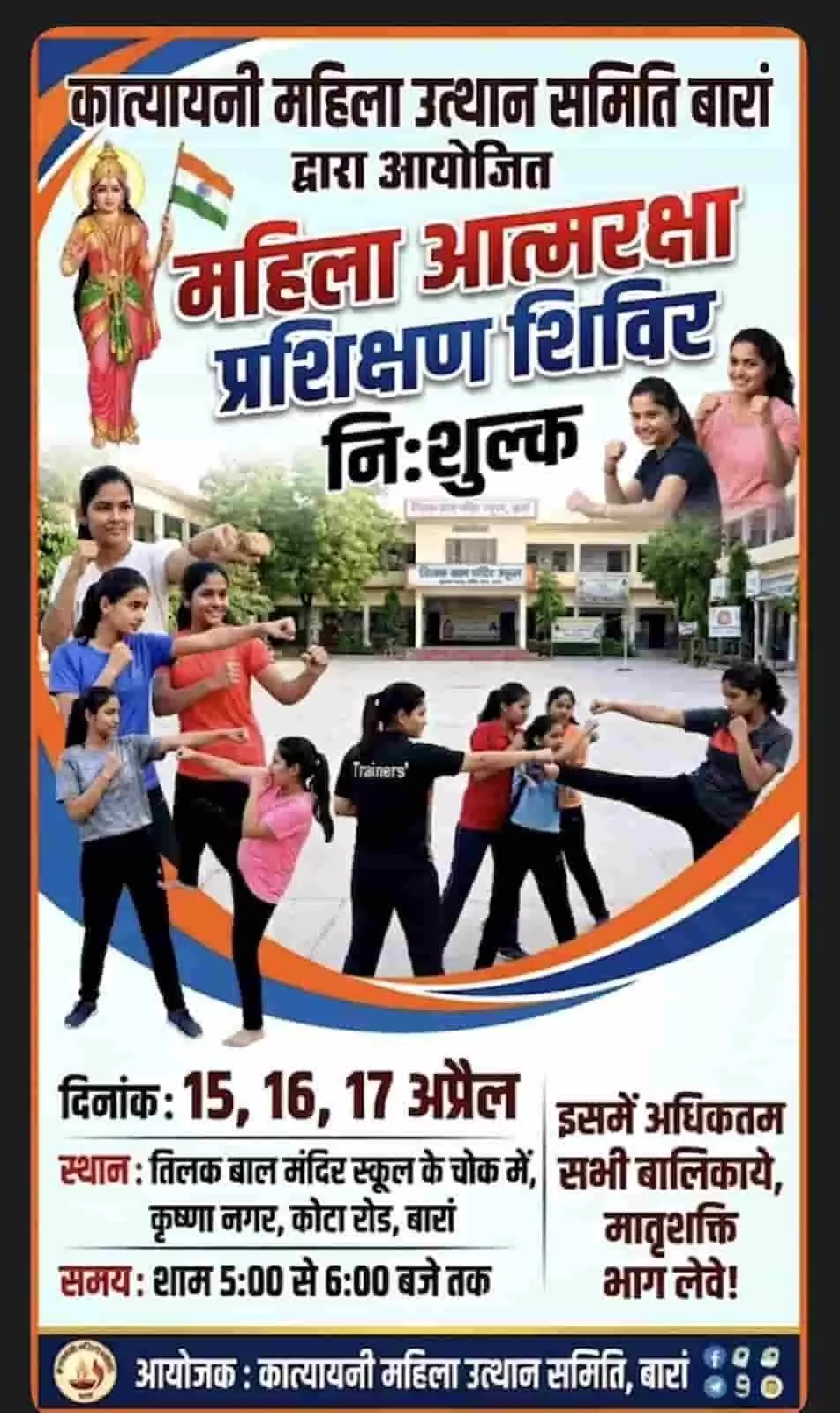 बारां में महिलाओं के लिए तीन दिवसीय निःशुल्क आत्मरक्षा शिविर 15 से
