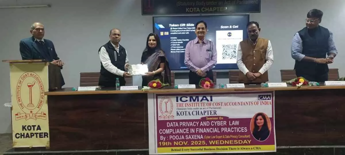 कोटा में सीएमए चैप्टर ने डेटा प्राइवेसी और साइबर लॉ अनुपालन पर विशेष सेमिनार आयोजित किया। डॉ. पूजा सक्सेना और वरिष्ठ विशेषज्ञों ने वित्तीय प्रथाओं में डेटा सुरक्षा और कानूनी अनुपालन के महत्व पर गहन चर्चा की। सीएमए सदस्यों और छात्रों ने सेमिनार में सक्रिय भागीदारी निभाई।