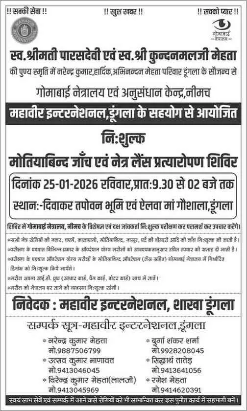 राजसमंद के अमरतीया में भगवान देवनारायण जन्मोत्सव के दौरान उमड़ा आस्था का सैलाब। श्री जालनाथ भेरूजी मंदिर में आयोजित दो दिवसीय समारोह में मुंबई के कलाकारों की भजन संध्या पर झूमे भक्त। सेवादार सोहनलाल, अशोक और निलेश धींग ने दिए आशीर्वचन। मेवाड़ सहित गुजरात, महाराष्ट्र और कर्नाटक के प्रवासियों ने लिया भाग। पढ़िए इस भव्य धार्मिक आयोजन की पूरी रिपोर्ट।